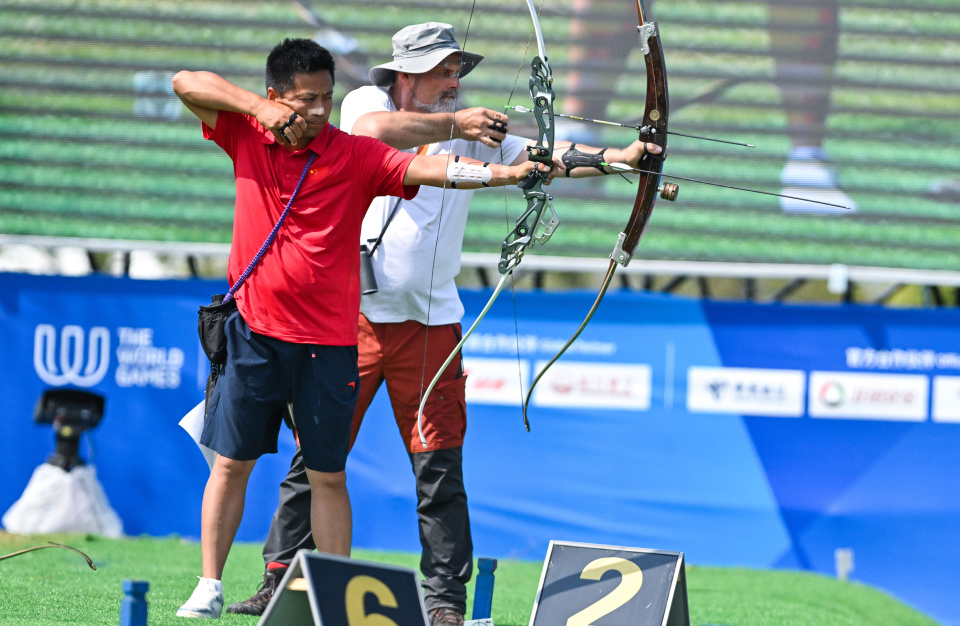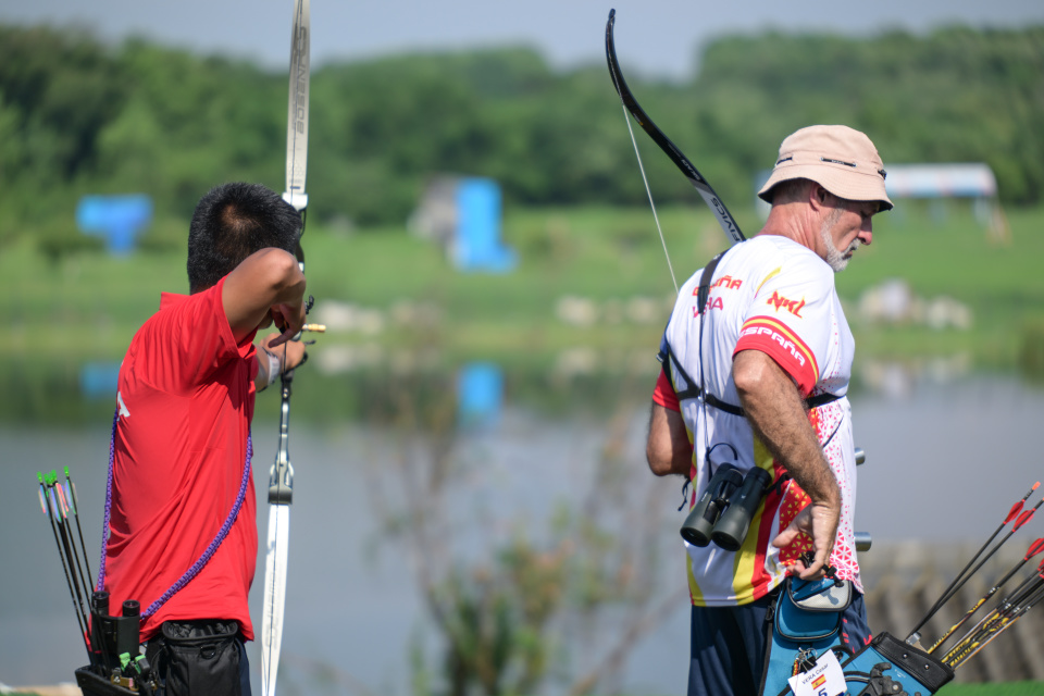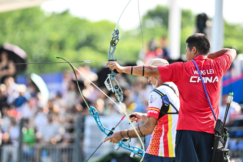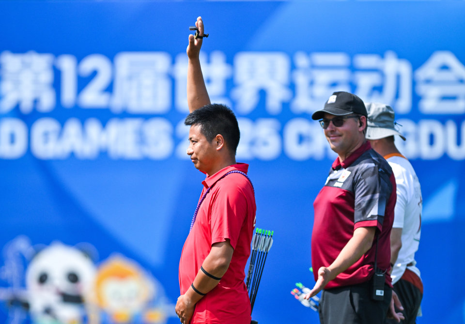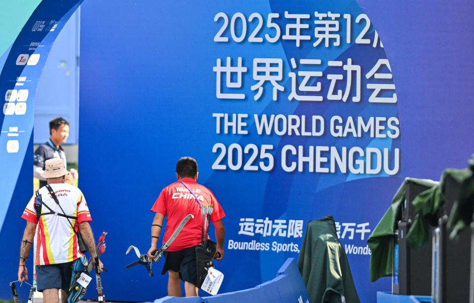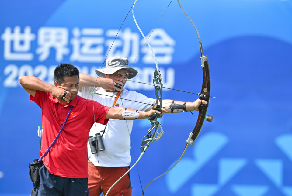 当日,在2025年成都世运会野外射箭男子光弓淘汰赛中,中国选手王蕾首先淘汰匈牙利选手莫尔纳,但随后不敌西班牙选手贝拉,无缘半决赛。8月15日,中国选手王蕾(左)与西班牙选手贝拉在比赛中。新华社记者 杨文斌 摄