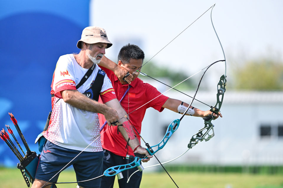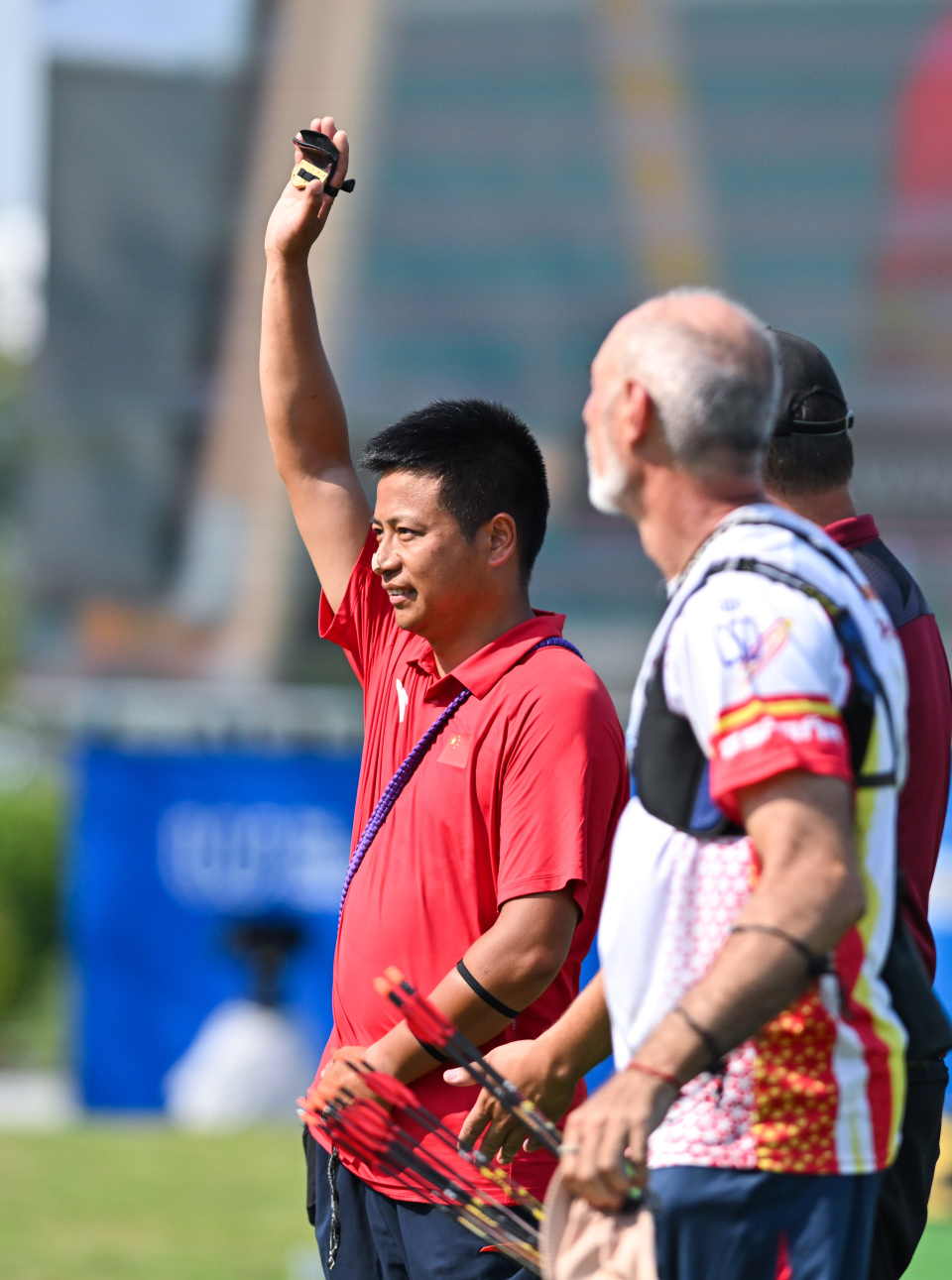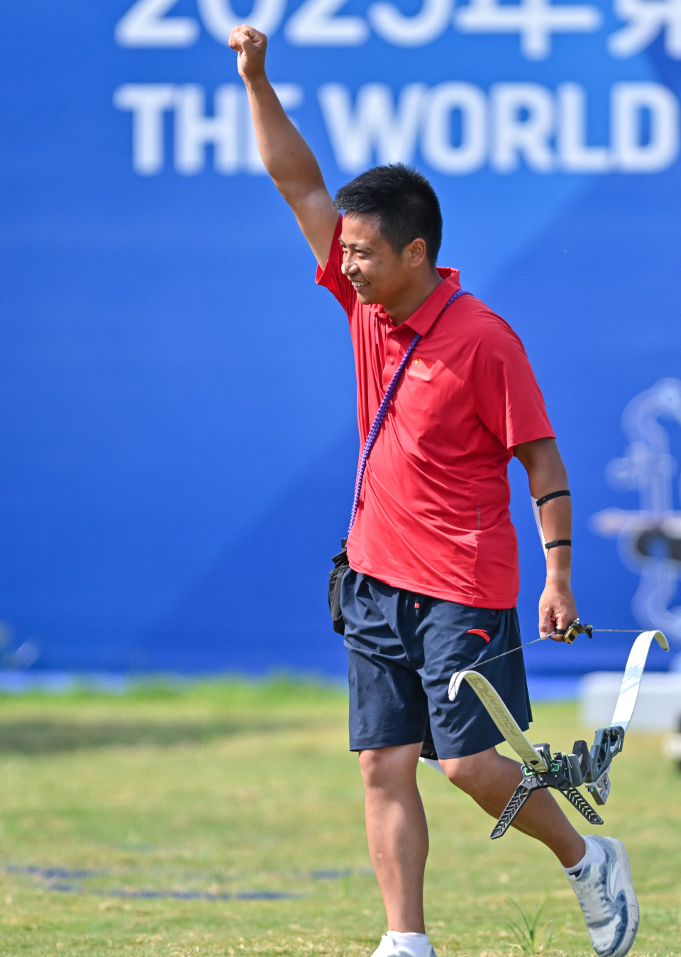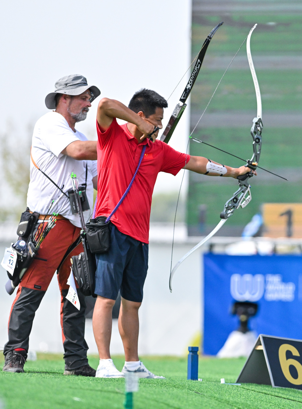 当日,在2025年成都世运会野外射箭男子光弓淘汰赛中,中国选手王蕾首先淘汰匈牙利选手莫尔纳,但随后不敌西班牙选手贝拉,无缘半决赛。8月15日,中国选手王蕾(左)与西班牙选手贝拉在比赛中。新华社记者 杨文斌 摄